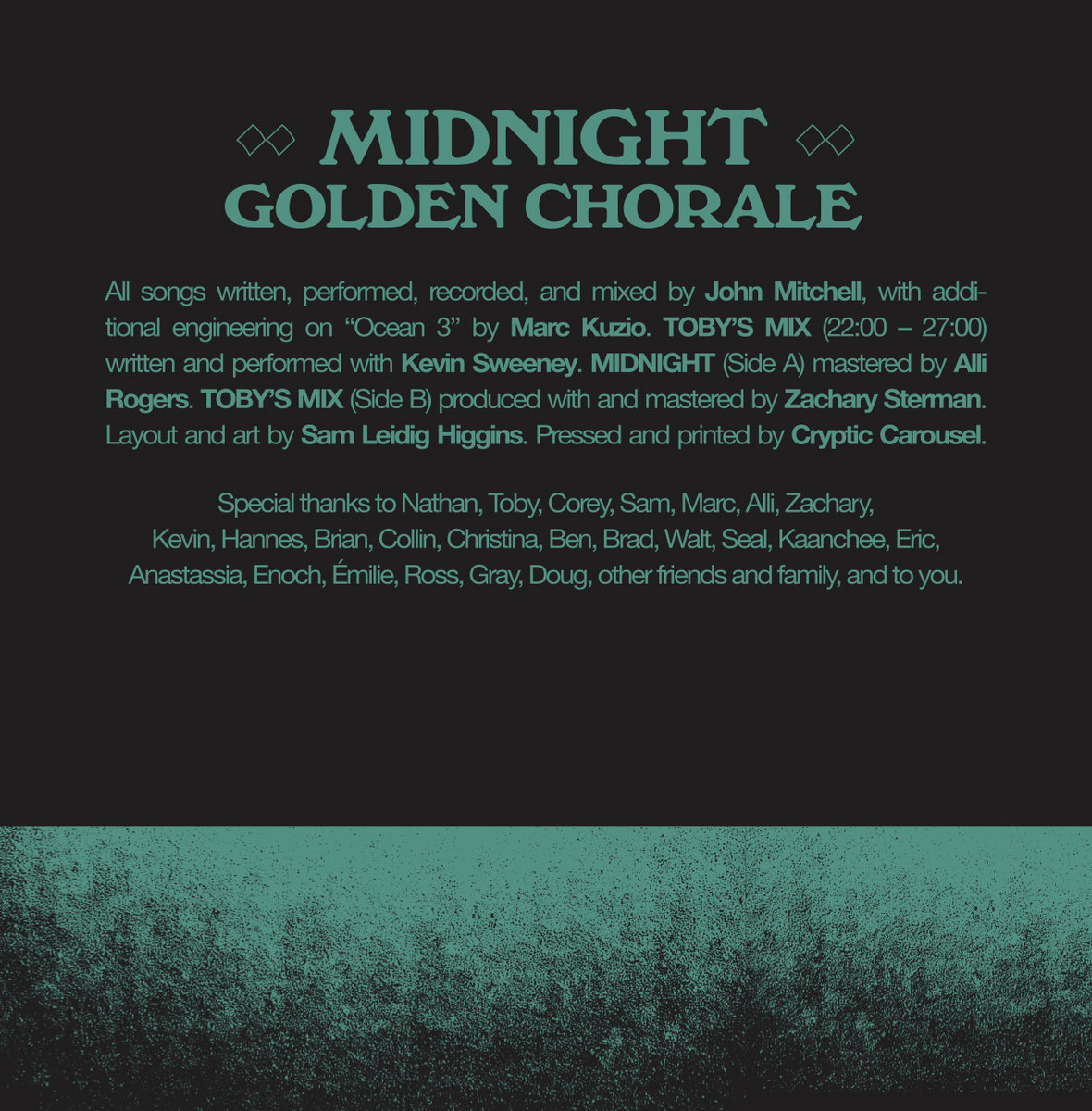golden chorale is John Mitchell, based in Garner, NC. He creates ambient music with electric guitar, bass, synthesizers, tape machines and the computer. He also makes ambient synth music under the name midcentury modular, as part of the synth improv trio ops, and previously as a guitar/bass player in the bands Less Western and SMLH. ... more